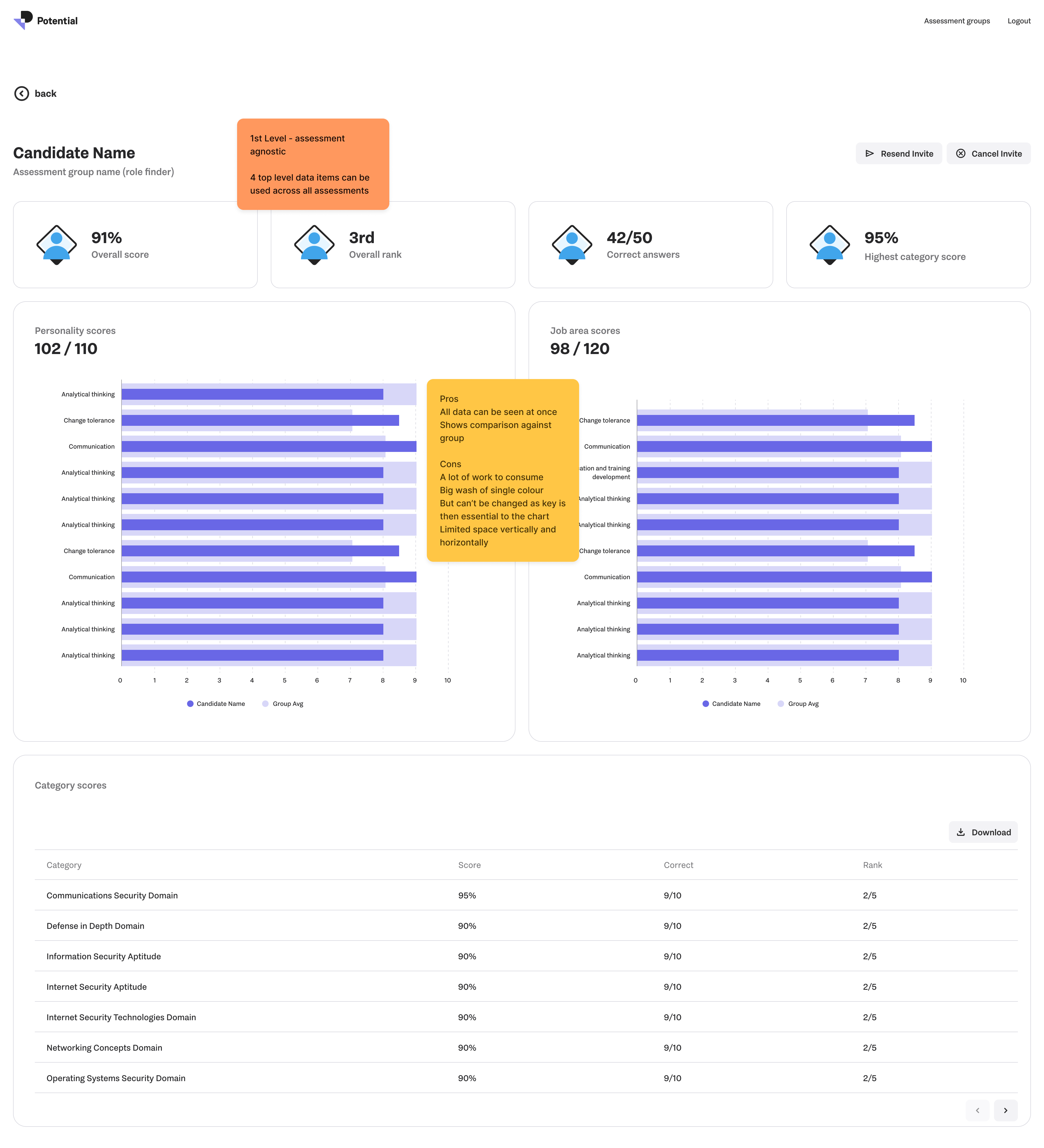 Candidate results screen showing assessment outcomes using the charting library and shared UI library components.