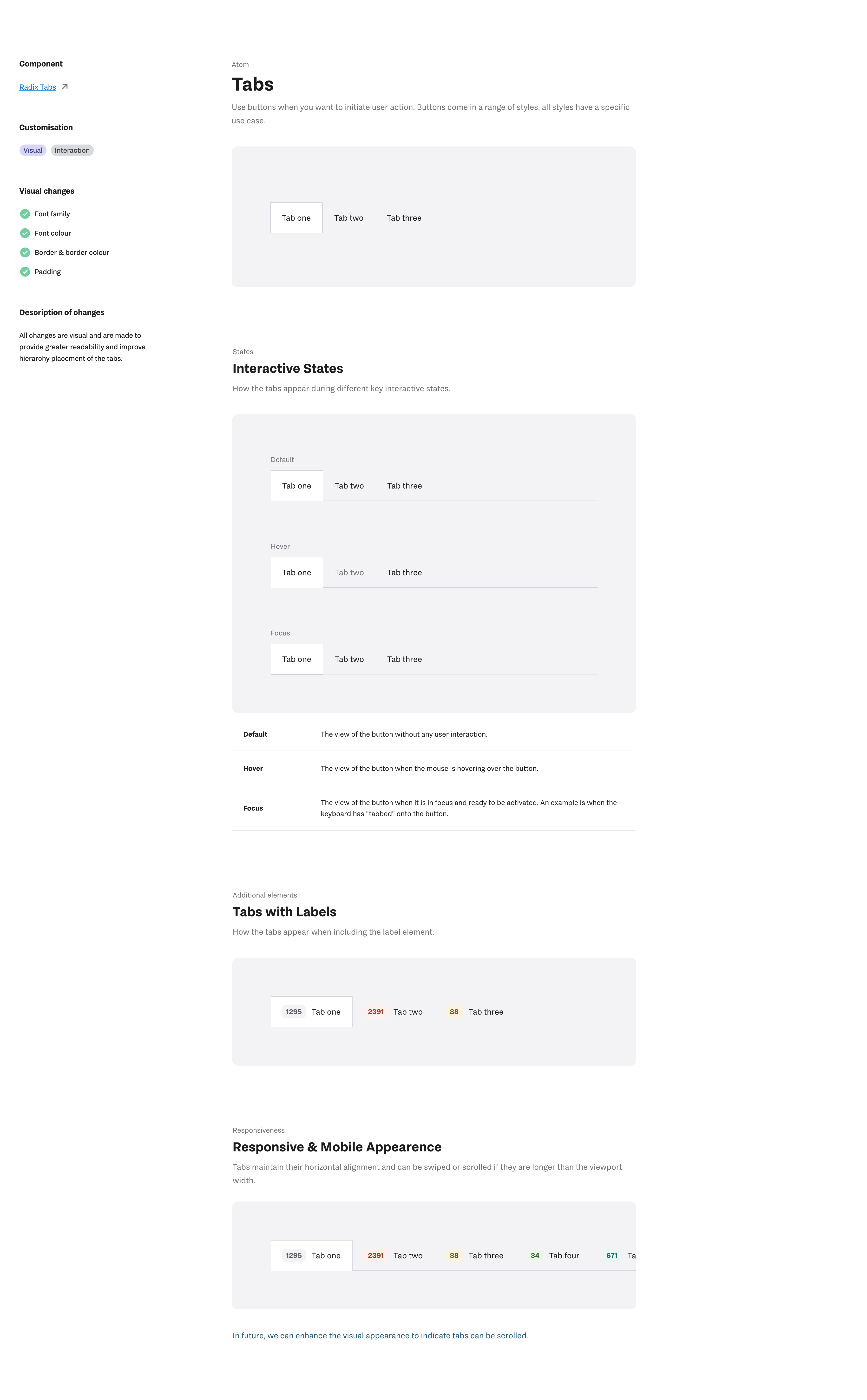 UI library documentation for the tab component, detailing the component library used, interaction states, responsive behaviour, and visual refinements.