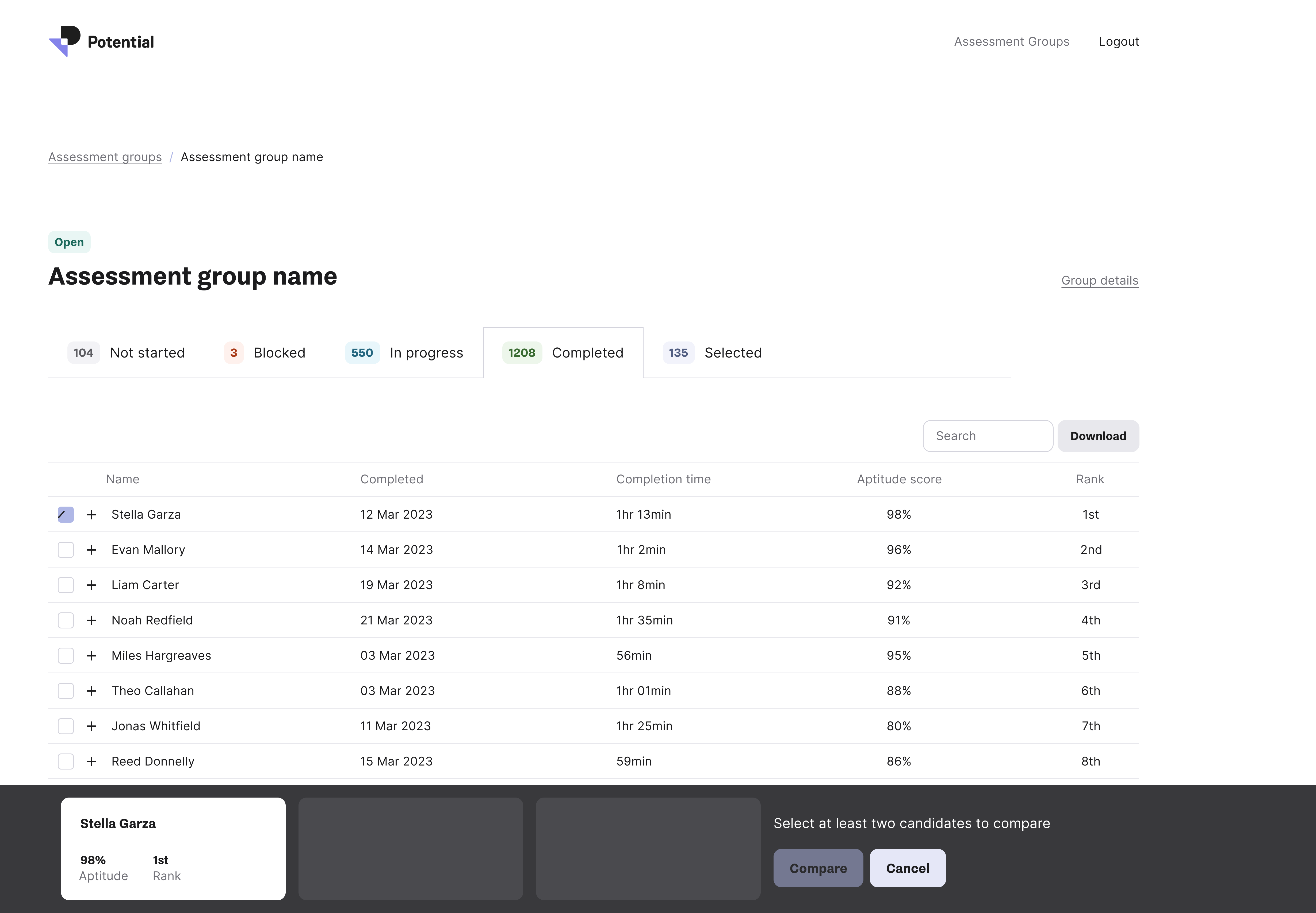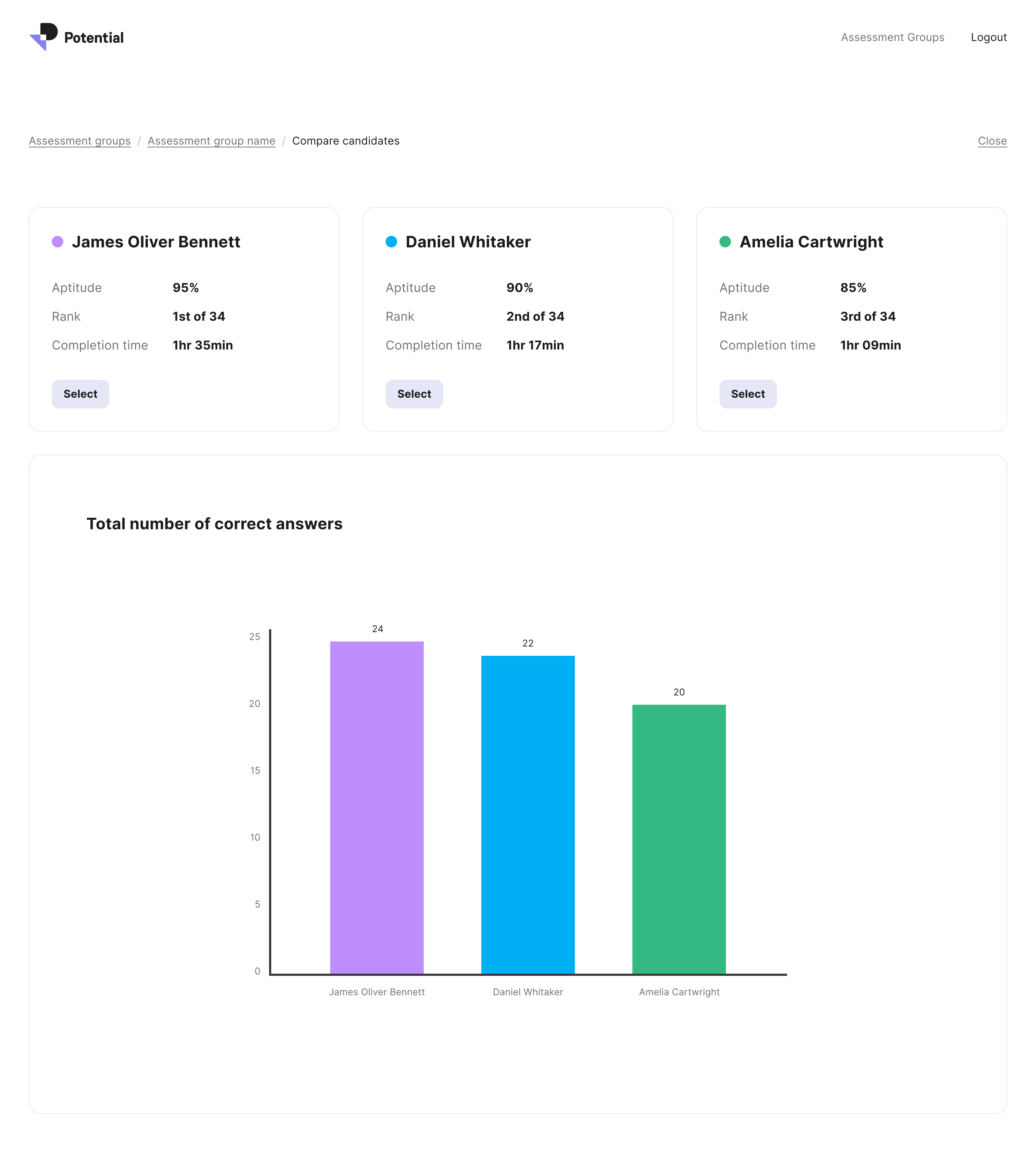 The candidate view demonstrating aptitude and their performance against the cohort.