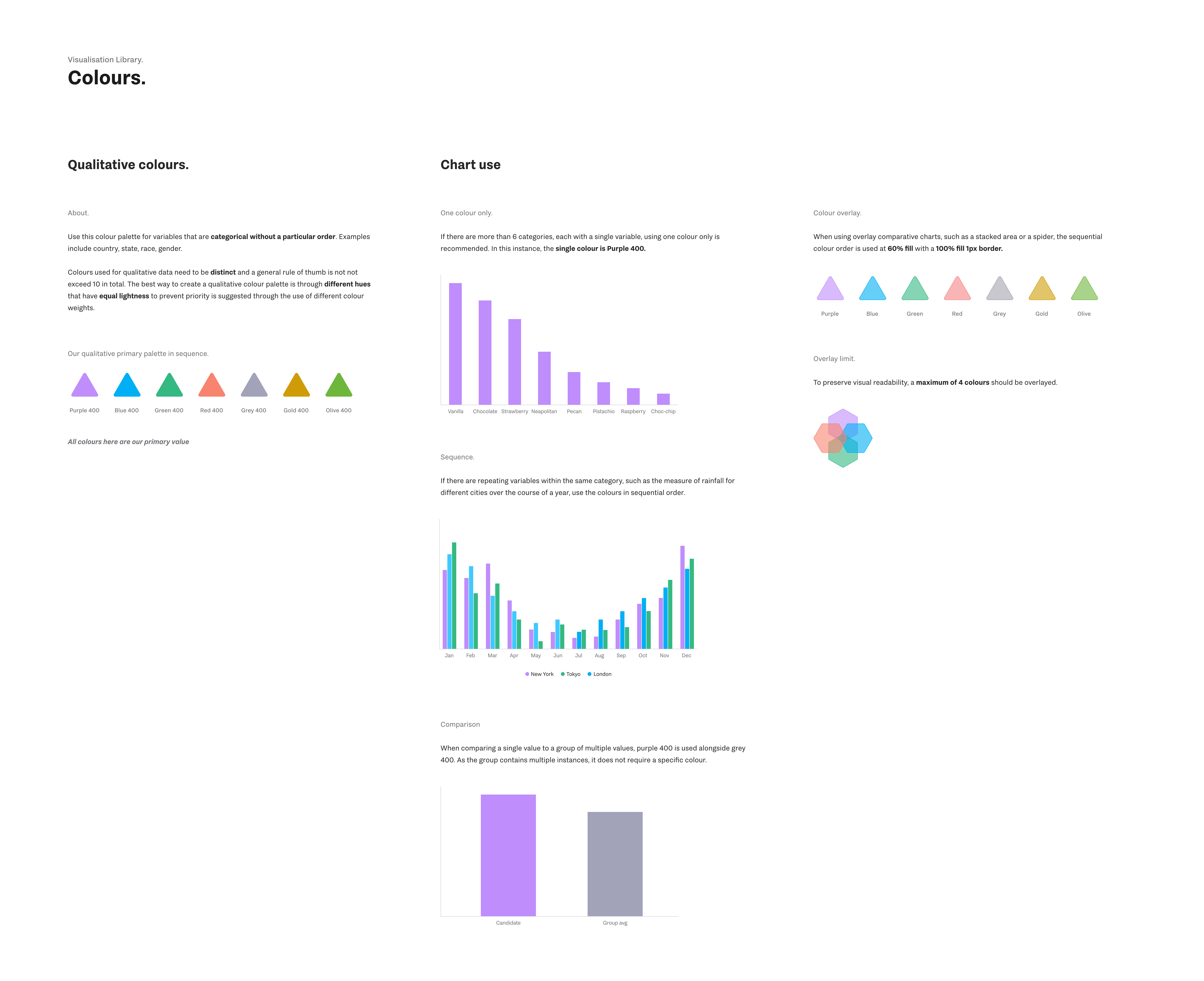 I created two distinct style guides. This is our chart guidelines that describes the use of colour for ordered and unordered charts.